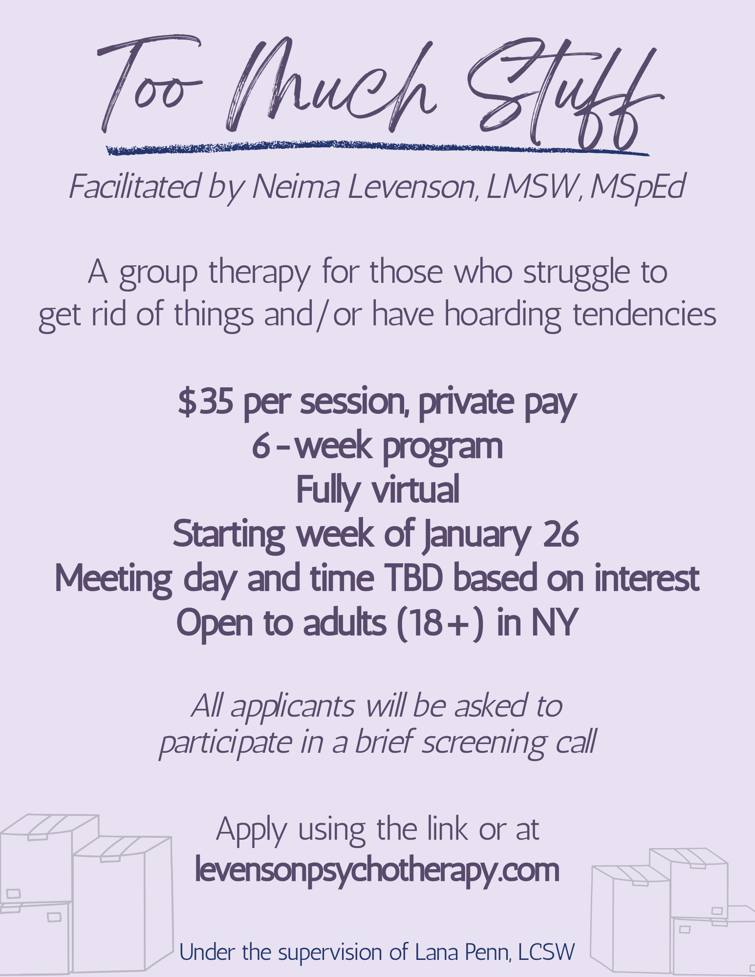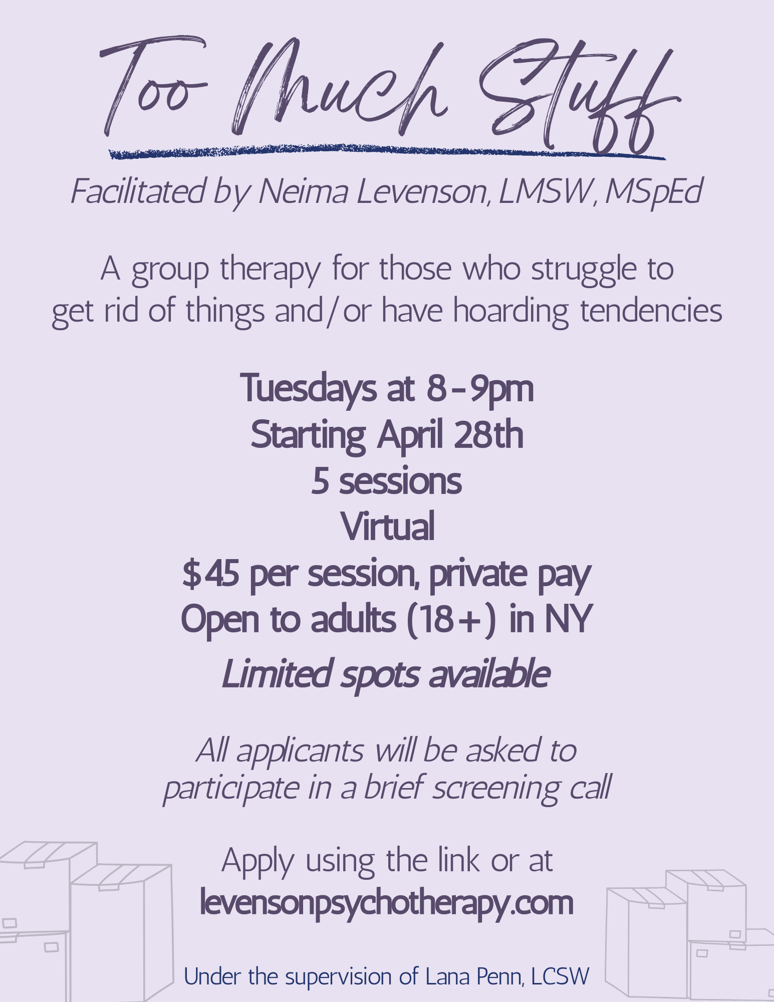 This group therapy “Too Much Stuff” provides a supportive and educational space to help individuals who struggle to discard items, and/or who have hoarding tendencies.
