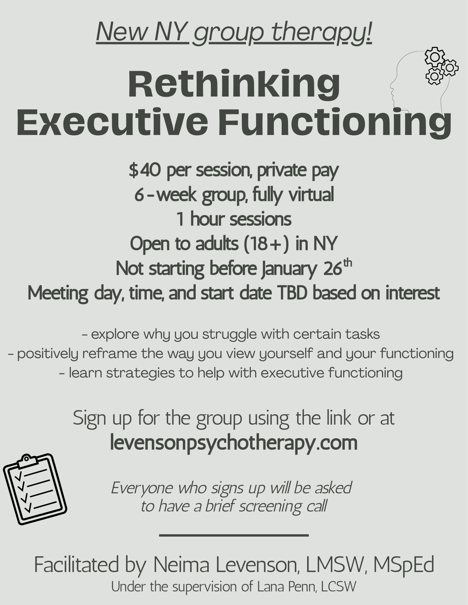 This group will be a space to speak about your specific challenges, learn how to restructure the way you think about executive functioning and gain practical tools to function more strongly.